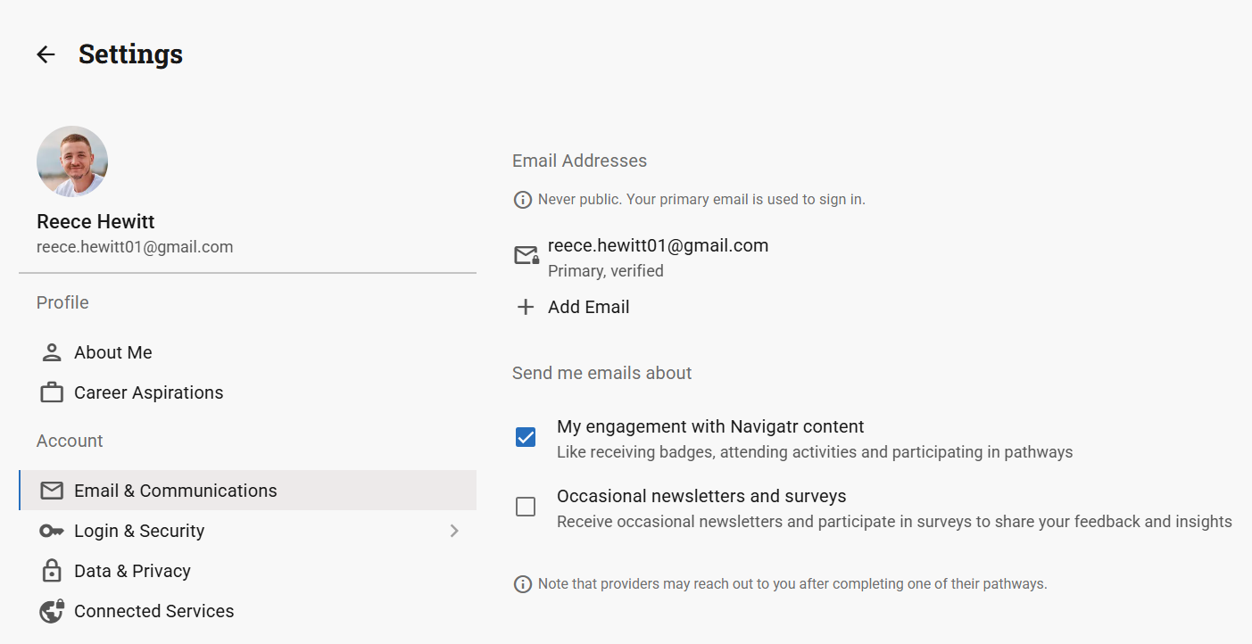 Note: The primary email is where you'll receive Navigatr notifications by default.