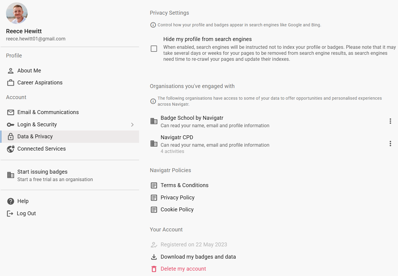 Navigatr respects your data rights and allows you to obtain a copy of your personal data, including badges, for your records or personal use.