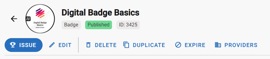 - Delete: Deleting a badge permanently removes it from the system and revokes it from all previous recipients. This action is irreversible, so use it with caution. For badges that have already been issued, consider expiring instead so that recipients don't lost access.