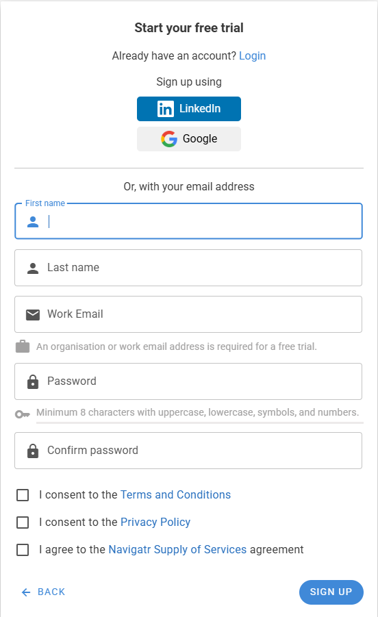 If you’re having trouble signing up, check that you're using a valid work email address. For further help, please contact support@navigatr.app.
