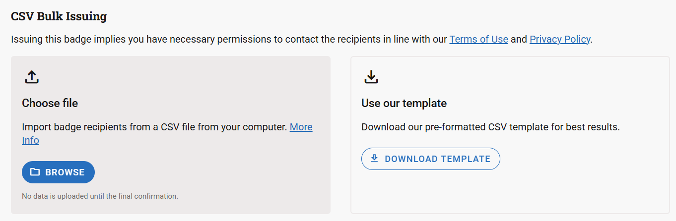 - Download the pre-formatted CSV template provided on the Bulk Issuing page for best results.