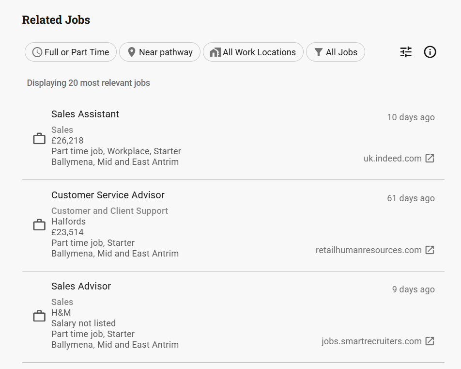 The Job Feed uses a built-in integration with labour market data from Lightcast, combined with your pathway’s metadata.
