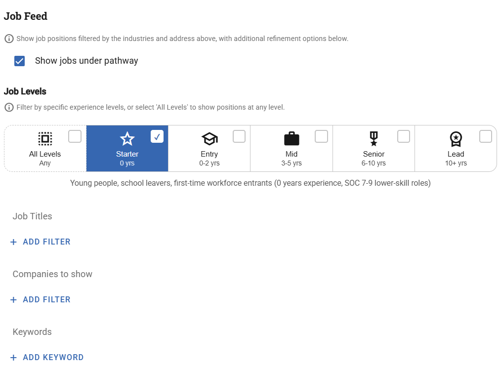 Tip - If the job feed is displaying too few opportunities, your filters may be too strict. Preview your pathway often to see how your filters are affecting the results.