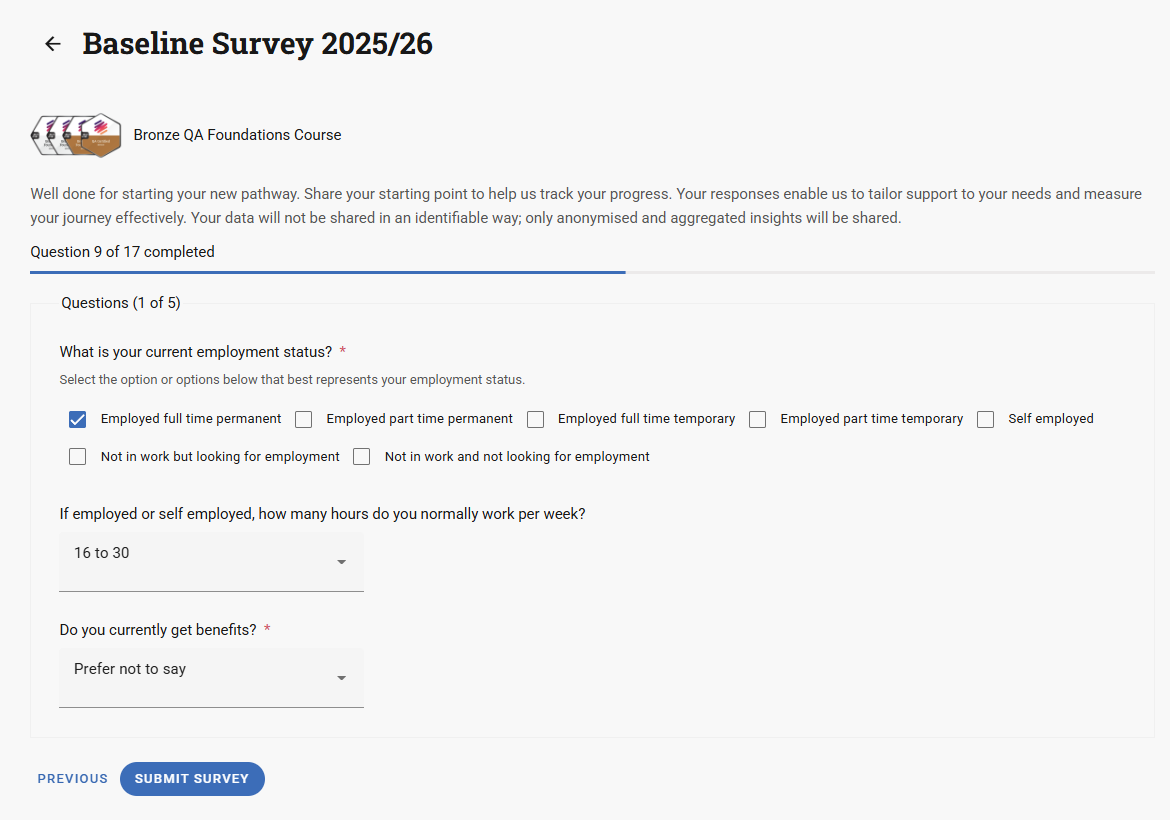 - Baseline Survey: Sent when someone starts a pathway. This captures where they are starting from: their confidence levels, skills, and current situation.