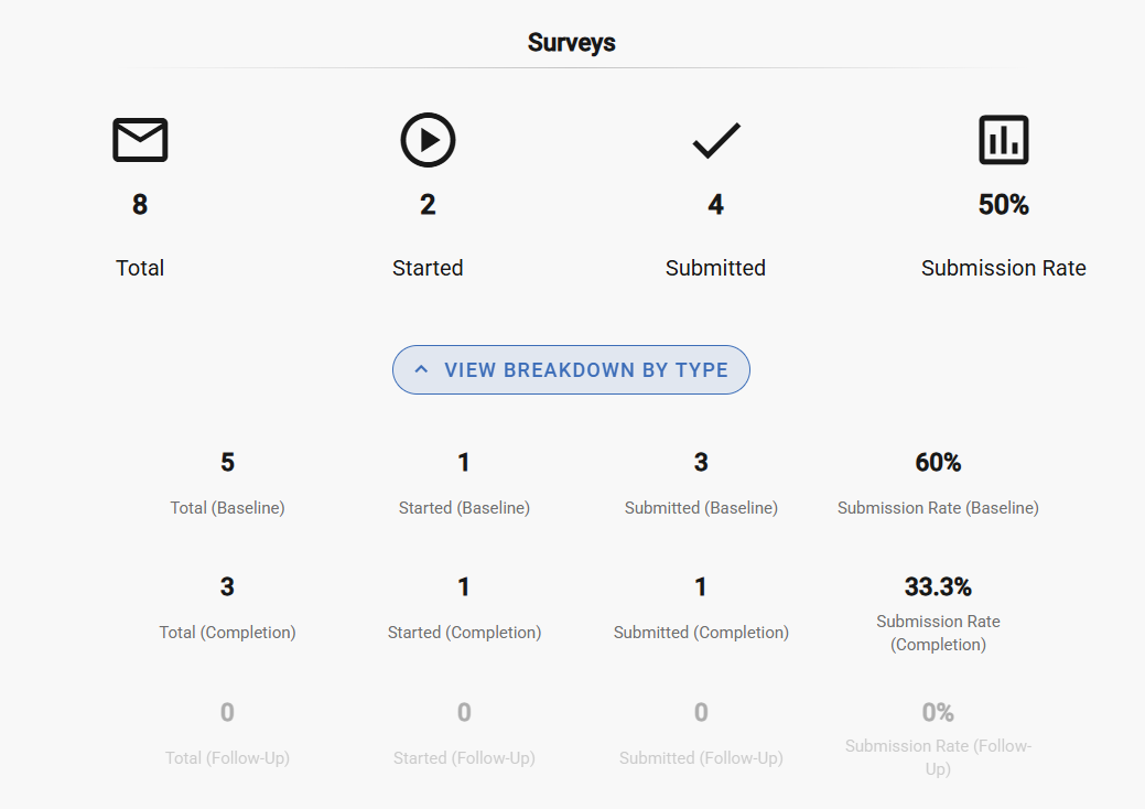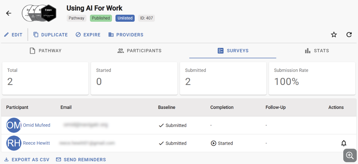 - See everything at once: The Pathway Surveys tab shows you all participants and their survey status: who has been invited, who has started, and who has completed each survey.